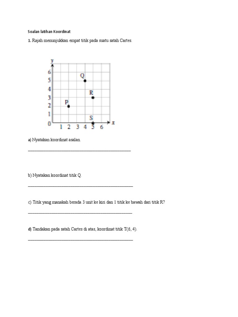 Standard kandungan 161 Koordinat pada sukuan pertma Standard pembelajaran iii Menentu dan menyatakan kedudukan objek pada paksi mengufuk. Latih tubi ini adalah dalam Bahasa Melayu dan mengandungi 40 soalan.